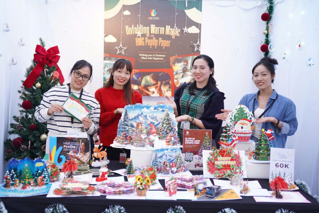 Among the many products at the fair, HMG’s Christmas-themed 3D Popup cards consistently stand out as a highlight, capturing the attention of the crowds. This line best exemplifies HMG’s spirit of innovation and creativity, where sophisticated paper engineering meets unique three-dimensional design to create surprisingly vivid models. Opening the card feels like stepping into a magical moment: Santa Claus delivering gifts, a reindeer sleigh soaring through the night sky, or tiny snow-covered cottages shimmering under the lights. All appear with such realism that they inevitably bring a delighted smile to the viewer.